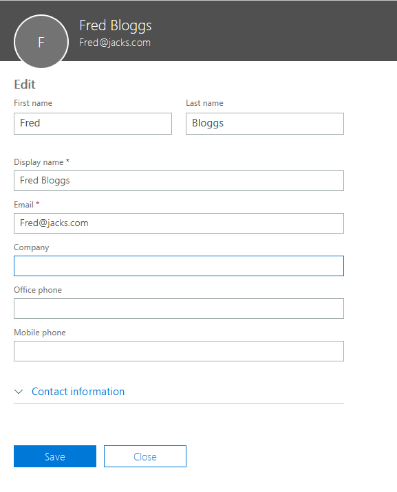 To begin with you need to setup a contact in Office 365 for the other email address – Fred@Jacks.com: